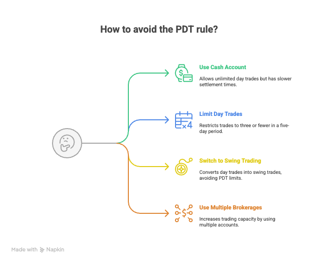 - Use a Cash Account: Cash accounts are exempt from the PDT rule, allowing unlimited day trades. However, note that cash accounts have slower settlement times (T+2 for stocks).